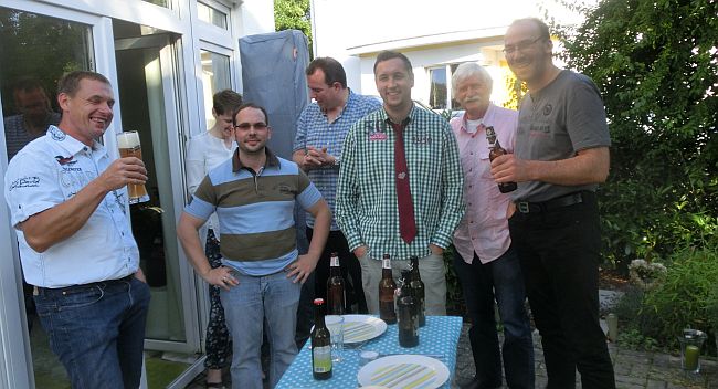 Zwei, drei Kegelbrüder konnten es nicht lassen, bei besten Sommerwetter sich über die Arbeit zu unterhalten. Andere Kegelbrüder genossen derweil den schnuckeligen kleinen Garten mit dem herlichen Wetter und kühlen Getränken. Erst als die Sonne am Horizont versank, rückte man zusammen um den wärmenden Strahl der „Wärmemaschine“ zu geniessen.