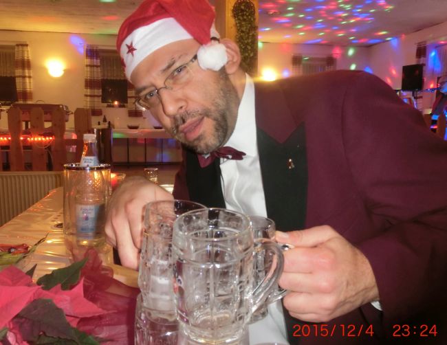 Kegelbruder Hannes Kempf hatte zu seinem sechzigsten Geburtstag in die Saccushalle in Sack geladen. Bedingung: Jeder sollte etwas rotes anziehen. Dies war für die Kegelbrüder nicht sehr schwer weildas Sakko einen roten Grundton hatte. Der Alteber „peppte“ dies nochmals durch eine Nikolausmütze für die Kegelbrüder auf.